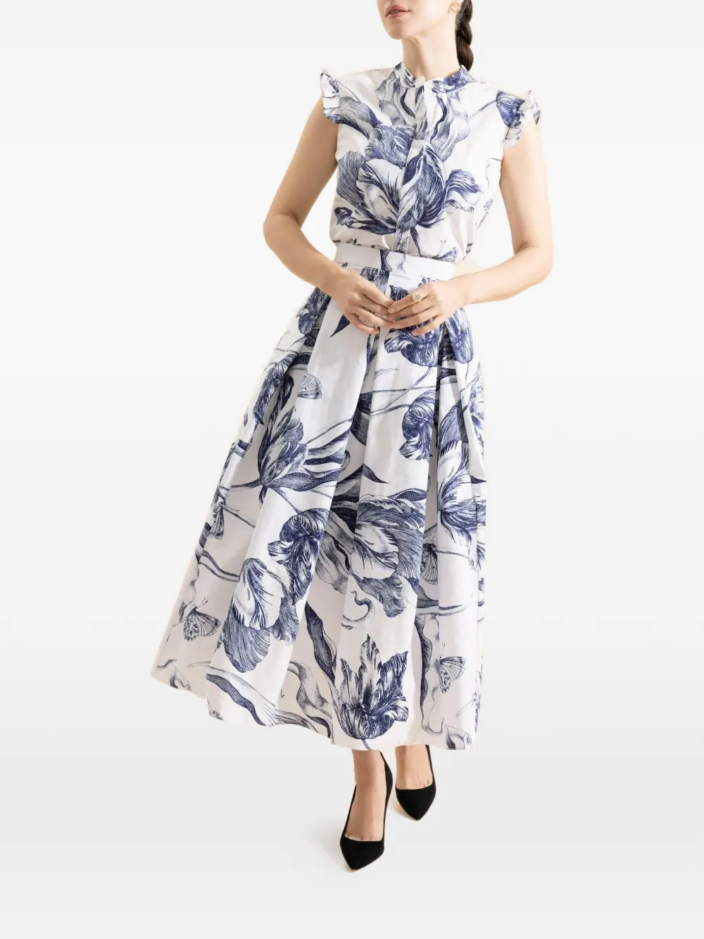 New Season ERDEM floral-print pleated midi skirt Imported Highlights white and blue floral print pleated design Composition Organic Cotton 100% Washing instructions Dry Clean Only Product IDs FARFETCH ID: 32955676 Brand style ID: PS26S1051069002