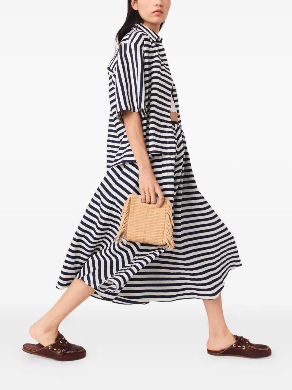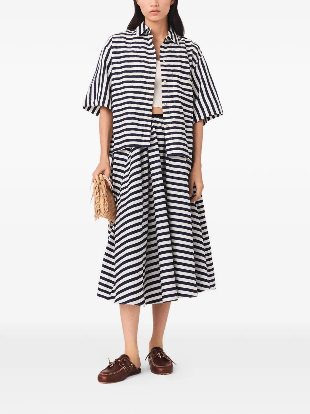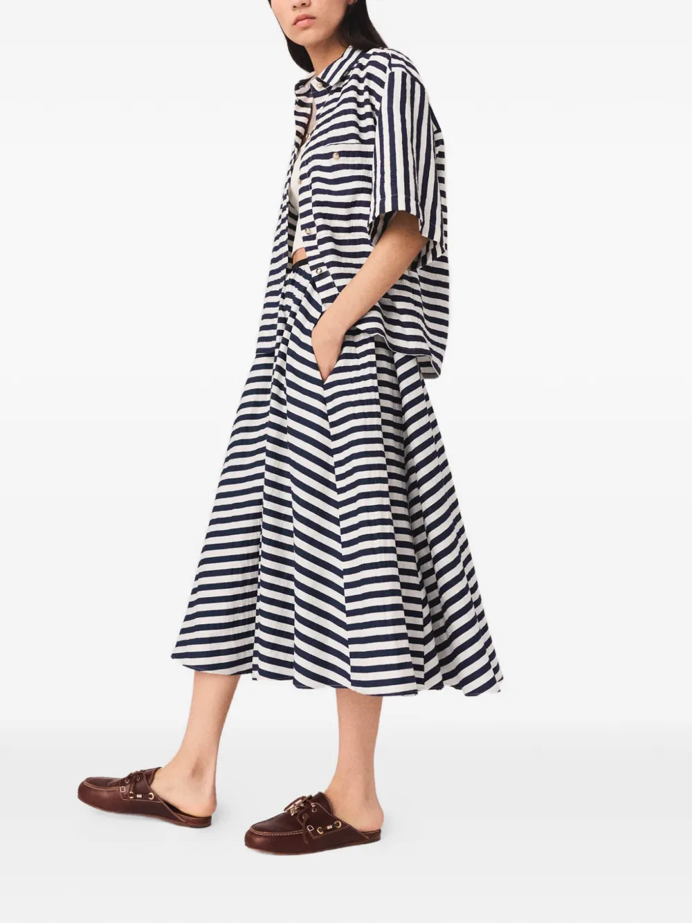 New Season Maje striped A-line skirt Imported Highlights white/blue striped elasticated waistband cotton pockets Composition Polyester 33%, Cotton 32%, Linen/Flax 24%, Polyamide 11% Washing instructions Read Manufacturer Guidelines Product IDs FARFETCH ID: 33233904 Brand style ID: MFPJU01651