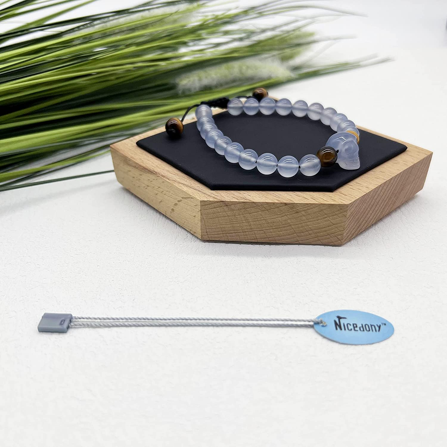 Nicedony Natural Premium Blue Chalcedony Agate Bracelet with Skull and Tiger Eye Stones for Women and Men