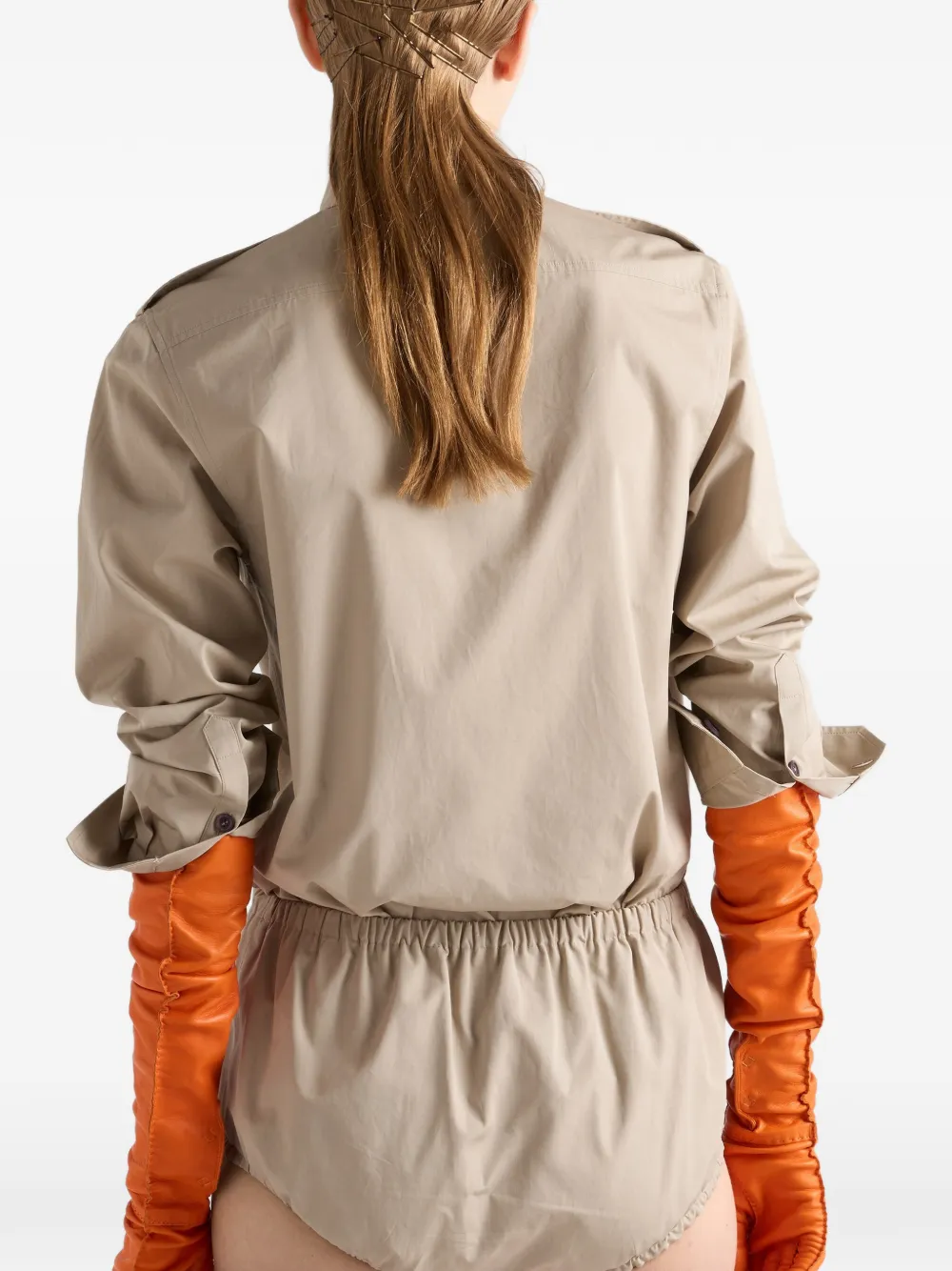 These shorts strike a new balance between contemporary lines and the pragmatic simplicity of workwear. The boy shorts style made of poplin features elasticized details that create soft volume to lightly envelop the body.
