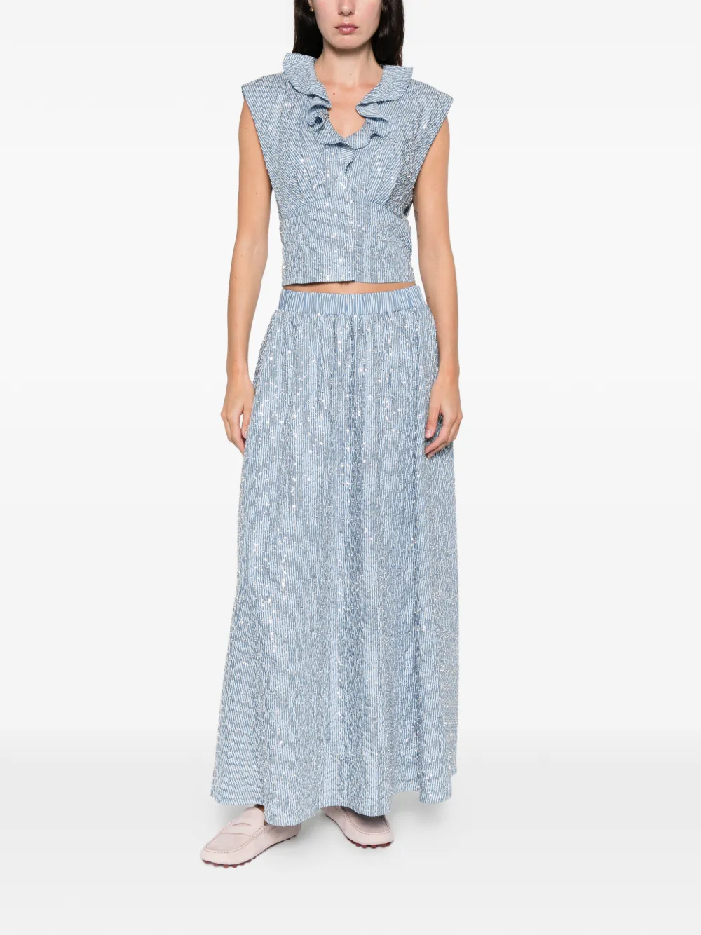 New Season SANDRO striped-pattern embellished maxi skirt Imported Highlights blue striped pattern embellished elasticated waistband A-line silhouette textured Composition Outer: Lyocell 100%, Sequin 100% Lining: Polyester 100% Washing instructions Read Manufacturer Guidelines Wearing The model is 5 ft 10 in. Product IDs FARFETCH ID: 32553013 Brand style ID: SFPJU01609